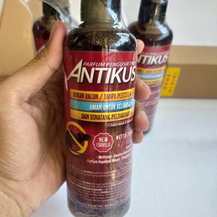 Parfum Antikus Rat Repellent Pengusir Tikus Cairan Anti Tikus Ampuh Usir Tikus Mobil Motor Spray 250ml( PENGIRIMAN KE LUAR PULAU JAWA HARUS!! MENGGUNAKAN JASA KIRIM ID Expres, AnterAja, JNE, JTR atau J&T Eco )PARFUM ANTIKUS BERFUNGSI SEBAGAI :1. Dengan Bau parfum khusus mampu mengusir tikus.2. Memberikan efek jera pada tikus untuk tidak datang lagi di tempat yang sedang di semprot Antikus.3. Melindungi Mobil Anda dari gangguan tikus.4. Melindungi Ruangan / Rumah anda dari bau bahkan kotoran tikus.Kenapa Harus Pilih Produk Ini ?- Brg 100% Original- Murah Hasil Wah- Packing pengiriman aman. ( PENGIRIMAN KE LUAR PULAU JAWA HARUS!! MENGGUNAKAN JASA KIRIM ID Expres, AnterAja, JNE, JTR atau J&T Eco )Deskripsi Produk1. 1 (satu) Botol Antikus kemasan botol Spray Triger volume 250ml2. kardus packing (free / Gratis)3. Tambahan Buble wrap ( Free / Gratis )Bisa bayar di tempat / COD by J&TKini Antikus Hadir Dengan Label Baru. Untuk menghindari produk tiruan.CARA BARU MENGUSIR TIKUS 1. ANTIKUS Formula Pengusir Tikus dengan Fragrance Technology Formula dengan formula yang ramah lingkungan, diformulasikan untuk melindungi kap mesin mobil, kabel anda, dan yg tidak terjangkau dgn pel dari serangan tikus dan kecoa. 2. ANTIKUS tidak mengandung bahan kimia/racun/pestisida sehingga aman untuk manusia. Dengan pemakaian rutin*, Formula ANTIKUS memberikan efek trauma pada tikus dan kecoa sehingga mereka tidak akan datang kembali ke tempat yang telah diberikan. 3. Tidak membuat karat pada mesin mobil.*pemakaian rutin selama 3 hari berturut-turutCara pemakaian:1. Kocok terlebih dahulu2. Semprotkan ANTIKUS Spray ke kap mobil, kabel, dll yang tidak terjangkau oleh pel dengan jarak DEKAT (terlihat basah +- 4x semprot) .3. Biarkan ANTIKUS bekerja dengan sendirinya. Anjuran: - Harap semprot dalam jarak dekat agar tidak tersebar oleh angin. - Digunakan disore hari karena Tikus aktif di alam hari. Warning:- Harap memakai penutup hidung / masker saat menyemprotkan, karena bau sedikit menyengat. - Jangan terkena mata. Jika terkena mata, bilas dengan air mengalir. - Jauhkan dari jangkauan anak-anak dan hewan peliharaan.Reseller welcomeKMY St