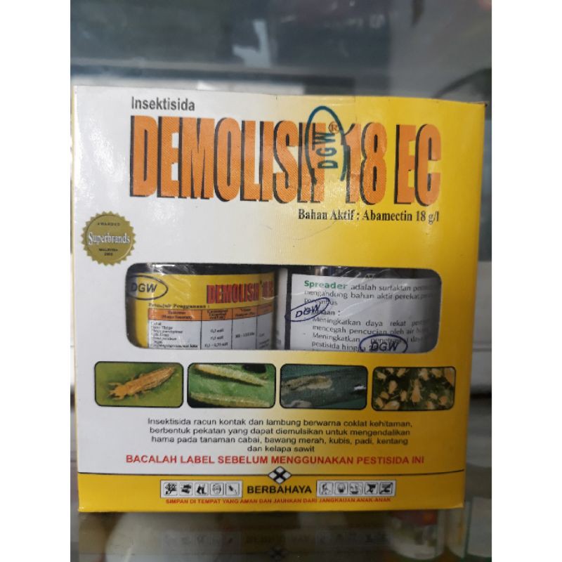 Bahan aktif :Demolish 18 EC : Abemectin 18 g/lspreader : Alkylphenol Ethoxylates Succinicester Sulfonic Acid SodiumImsektisida racun kontak dan lambung untuk mengendalikan hama pada tanaman cabai(thrips, kutu daun, tungau), bawang merah (penggorok daun), kubis (ulat daun, ulat krop), padi (wereng coklat, penggerek batang), kentang (pengorok daun), kelapa sawit (ulat kantong)Spreader adalah surfaktan pestisida yang mengandung bahan aktif perekat, perata, penembus.TIDAK MELAYANI PENJUALAN PESTISIDA DAN PUPUK BERBENTUK CAIRAN KE LUAR PULAU JAWA KECUALI LAMPUNG, BALI, DAN NTB#insektisida #demolish #demolish18ec #paketdemolish #paketdemolish18ec+spr
