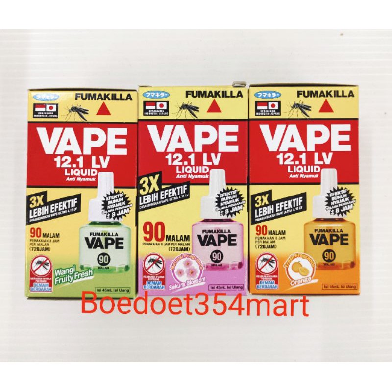 Isi ulang Vape Liquid 90 malam.- Larutan diuapkan dengan alat pemanas- tanpa asap dan ampuh usir nyamuk- tidak mengganggu pernafasan- efektif hingga 90 hr dengan pemakaian 8 jam/hr- Ukuran Alat Sama dengan Liquid 90 malam.Pilihan Aroma :-Fruity Fresh -Sakura Blossom-OrangeIsi pilihan di catatan saat checkout, akan dipilih sesuai stok yg rea