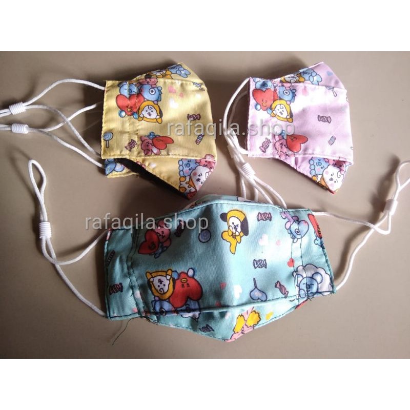 Masker karakter anak 3D BTS BT21 yang lagi ngehits.Fitur masker:Masker SNI 3 Lapis Type Cmasker bisa ditambah lapisan tisu jadi 4 lapis loh..masker sangat tebal, lapisan dalam menggunakan katun 100%mampu melindungi anak dari virus. mempunyai daya serap -+60 detikmasker dilengkapi dengan tali masker medis yang lembut sehinga tidak sakit di telinga.masker bisa digunakan untuk anak yg berhijab / berkerudung.masker menggunakan karet stopper sehingga bisa diatur kekencangan pemakaian masker.washable mask, masker dapat dicuci berkali kali.Masker dapat digunakan untuk usia 4th s/d