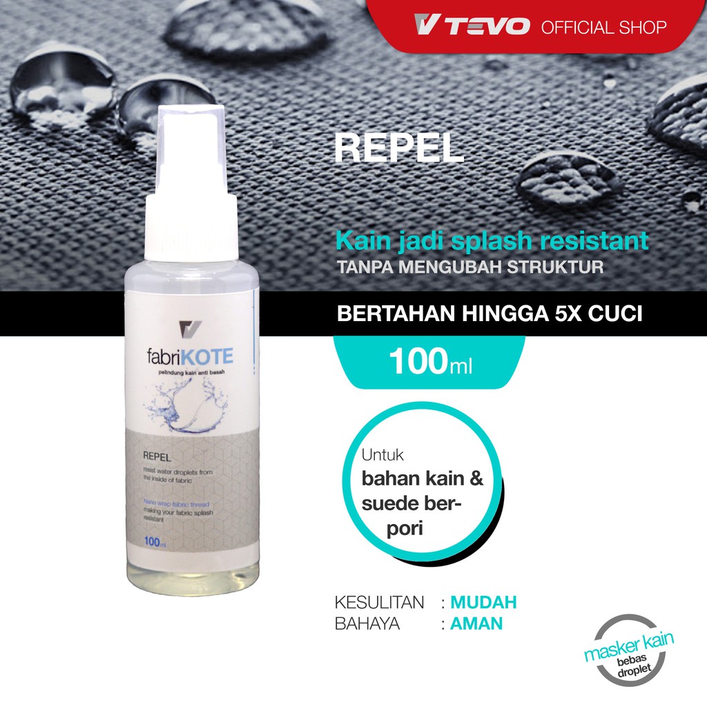 TEVO Fabrikote Masker Kain Sofa Interior jadi Water Resistant 5x Cuci100MLTEVO Fabrikote adalah sebuah inovasi terbaik untuk menjadikan semua jenis kain (spandex, katun, polyester, gore tex) dari yang semula bila terkena air akan meresap menjadi splash resistant, hydrophobic, water / fluid / droplet resistant & water repellent bak DAUN TALAS.100ml bisa 400-500 sprayper aplikasi 1 masker kain sekitar 6-10 spray saja.Tahukah Anda? masker kain setelah dicuci beberapa kali, efek anti basah / anti air nya DROP jauh. Gunakan Fabrikote untuk mengembalikan efek ANTI DROPLET dan memastikan KEAMANAN masker Anda.TEVO Fabrikote melapisi BUKAN pori-pori kain dan membuat kain masker / baju jadi panas dan tidak bisa bernafas (breathable), tapi Fabrikote melapisi micro yarn atau ujung2 benang di kain supaya surface tension atau tekanan permukaannya menjadi tinggi dan akibatnya droplet air tidak bisa masuk di antara nya. Efek ini tidak langsung hilang dengan 1x cuci tetapi akan turun perlahan-lahan dan mulai hilang di pencucian ke 3 atau 4.Sangat cocok digunakan untuk masker kain yang sudah mulai kehilangan tolak air nya. Ingat, droplet dari penderita penyakit ini keluar bahkan bila mereka hanya bercakap-cakap di dekat kita. Droplet ini terus berada di udara selama beberapa saat dan bila masker kain kita tidak water repellent atau punya sifat menolak air maka droplet di udara yang airborne ini ada kemungkinan akan masuk menempel pada masker dan tidak sengaja terhirup, terpegang atau meng-kontaminasi barang2 lain Anda.Fabrikote bisa digunakan di sepatu kets atau di topi yang mana sering terkena air.Fabrikote tidak mengubah warna (transparant) dan tidak mengubah tekstur kain.Fabrikote aman terhirup, tidak berbau dan eco friendly.Fabrikote bisa disimpan hingga 6 bulan selama tidak di tempat panas.Fabrikote aman untuk produk anak-anak.Fabrikote tersedia hanya dalam kemasan 30ml yang mudah dibawa-bawa.Fabrikote adalah produk dari TEVO Creations, Inc. Malaysia yang diimpor resmi oleh PT Palar Persada Sejahtera, TEVO Indon
