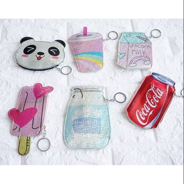Tempat koins Harga 22rb/pcs Motif: 1. Panda 2. Es krim 3. Minuman 4. Susu 5. Unicorn milk 6. Coca c