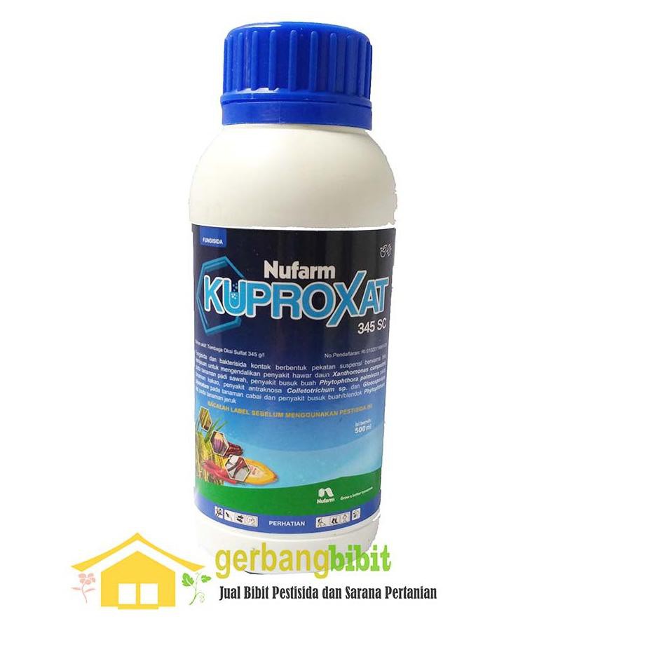 ★★★★★ Fungisida Kuproxat 345 Sc 500 Ml KEUNGGULAN PRODUK :KUPROXAT 345 SC mengandung tri-basic Copper Sulfate sebagai bahan aktifEfektif baik sebagai fungisida maupun bakterisida karena ukuran partikelnya yang sangat halus dan daya melekatnya yang baik.Satu-satunya produk berbahan aktif tembaga yang difrormulasi dalam bentuk cair.Spektrum yang luas yang bekerja secara multisite, sehingga jamur resisten menjadi sangat kecil.Ukuran partikel paling kecil dibanding fungisida tembaga lainnya sehingga penutupan yang baik pada tanaman.Bersifat rainfastness (tahan terhadap pencucian air hujan).PH formulasi dan larutan semprot bersifat netral, sehigga tanaman tidak akan stress pada saat disemprot.Stabilitas suspensi yang tinggi pada larutan dalam tangki, sehingga tidak ada pengendapan dan tidak menyumbat nozzle.Sebelum Order, Mohon untuk membaca dulu ya, karena kami tidak ingin mengecewakan costumer ka