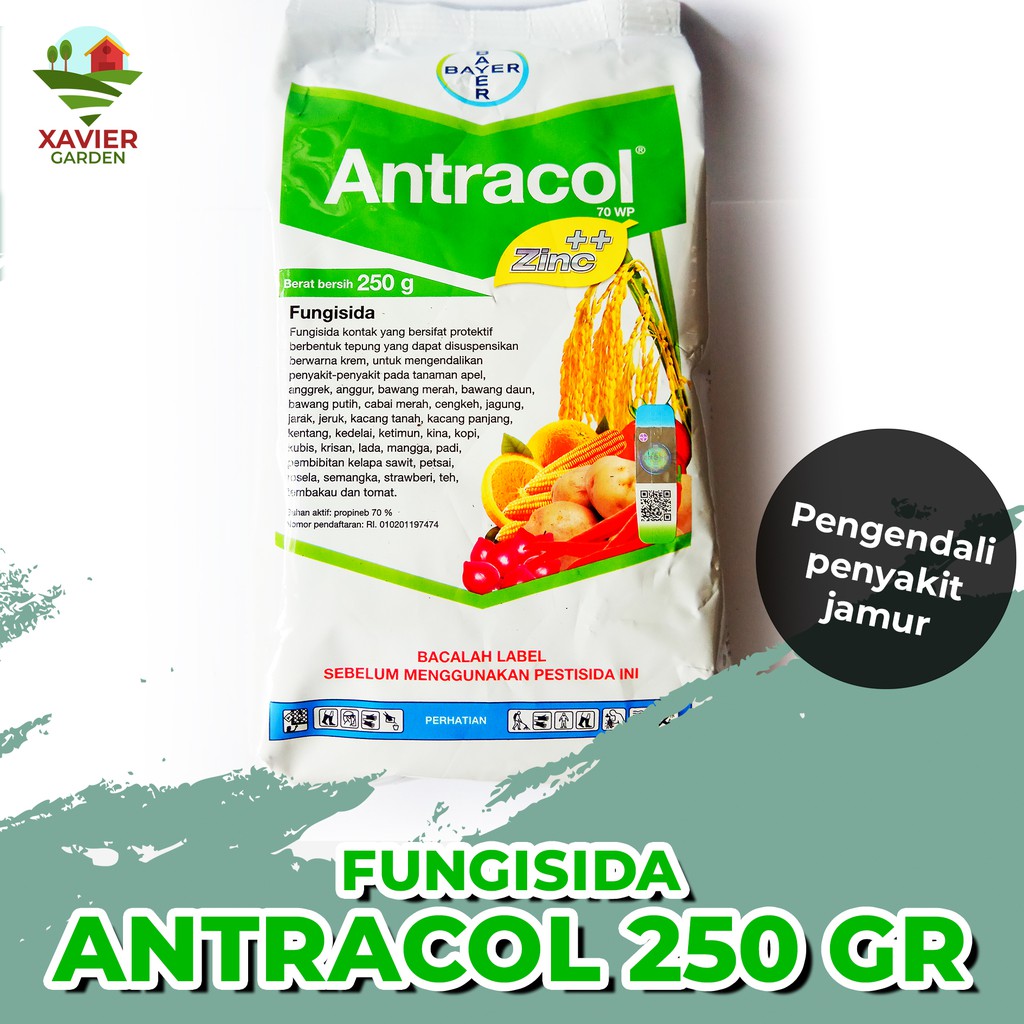 Deskripsi FUNGISIDA ANTRACOL Mengendalikan penyakit jamur pada tanamanFUNGISIDA ANTRACOL 70wp ++ZINCFungisida Antracol 70wp berwarna kremFungisida Antracol produksi pabrik terkenal Bayer.Isi = 250 grFungsi :Mengendalikan penyakit jamur pada berbagai tanaman : Anggrek, Cabe, tomat, jagung, bawang, jeruk, kentang, dllCara Penggunaan :dibuatkan larutan kental dengan sedikit air, kemudian tambahkan sedikit demi sedikit sambil diaduk sampai larutan merata. Larutan siap pakai ini harus langsung digunakan, tidak boleh didiamkan semalaman.Cara Pemakaian :Semprotkan semua bagian tanaman yang terserang jamur. pada tanaman yang berlapis lapisan lilin seperti bawang, tambahkan bahan perekat (sticker) kedalam larutan. Frekwensi penyemprotan ditentukan berat ringannya serangan jamur dan iklim.Dosis = 1 - 2 gr per 1 lite