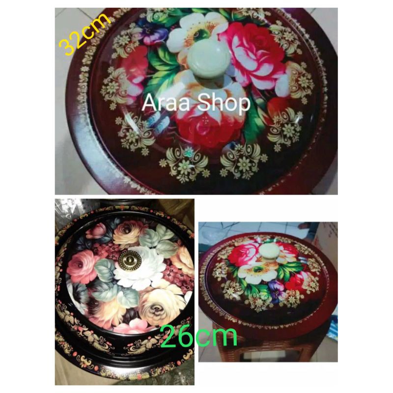 Baskom berbahan enamel coating dengan warna dasar merah dengan motif kembang yang menarik, yang dilengkapi dengan tutup berbahan sma ini berukuran diameter 26cm,28cm,30cm,36cmHappy Shopping@Araa Sho