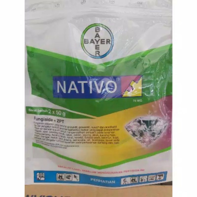 Nativo 75 WG (50 Gr) adalah Fungisida sistemik protektif, preventif, kuratif, dan eradikatif untuk zat pengatur tumbuh. Sangat baik digunakan untuk tanaman anggrek, apel, bawang, bawang merah, kakao, cabai merah, jagung, jeruk, kacang hijau, kacang panjang, kacang tanah, karet, kedelai, kentang, kopi, krisan, mangga, melon, mentimun, padi, pembibitan kelapa sawit, pisang, semangka, tembakau, tomat, dan teh. Bahan aktif : Tebukonazol (Tebuconazole) 50 % dan Trifloksistrobin (Trifloksistrobin) 25 %. Produksi PT. Bayer Indonesia. Kemasan 5