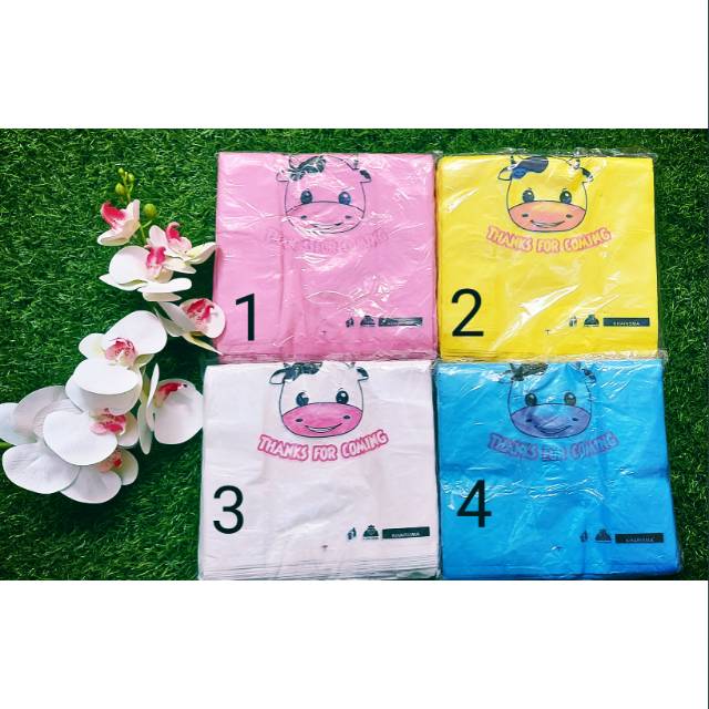Kantong Kresek motif cantik dan lucu bergambar sapi, ukuran :Kecil lebar 17cm isi kurang lebih 85 lembarBerat 250 grCocok untuk bungkus online shop yang bergerak dalam bidang aksesoris, pakaian, dll.Tersedia 4 warna: pink, putih, kuning, biru. Tolong dituliskan ket warna jika order dengan request warna, selamat belanja.#kantong #pa