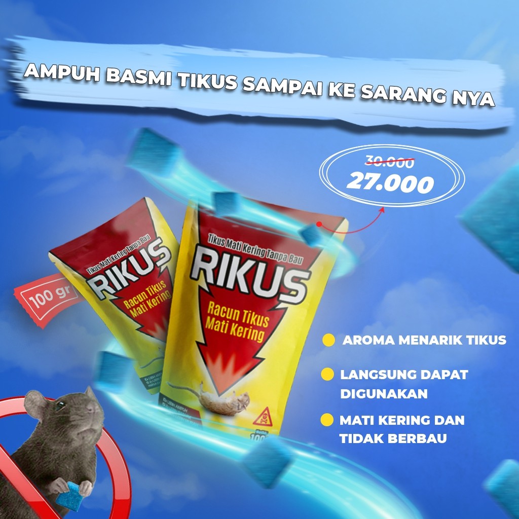 WAJIB BACA DESKRIPSI SEBELUM MEMBELIBasmi tikus sampai TUNTAS dengan MUDAH, tanpa BAU, dan tanpa RIBET.Pembasmi tikus berbentuk umpan siap pakai (WAX BLOCK). Praktis tinggal diletakkan di tempat yang dilalui tikus saja.AMPUH untuk membasmi:Tikus RumahTikus AtapTikus GotTikus SawahTikus Semakdan berbagai jenis tikus lainnyaCARA PENGUNAAN:1. Letakkan RIKUS di tempat yang sering dilewati tikus.2. Tikus akan tertarik untuk memakan umpan.3. RIKUS merusak organ tikus sehingga tikus kehausan dan cari sumber air.4. Temukan bangkai tikus dengan mudah di dekat umpan dan di sekitar sumber air.Tikus lenyap, rumah kembali bersih✨RUMAH TIDAK AKAN BAU BANGKAI KARENA:✅Bangkai tikus mudah ditemukan✅Tikus akan mati dalam keadaan keringDengan RIKUS akan:✅Basmi tikus sampai TUNTAS✅Membasmi tidak hanya 1-2 tikus, tapi KOLONI TIKUS✅Tidak bikin tikus curiga, karena aromanya DISUKAI TIKUSFAQ:1️⃣BAGAIMANA KALAU RIKUS TIDAK SENGAJA TERKONSUMSI MANUSIA?Jangan khawatir karena RIKUS punya anti racunnya yaitu vitamin K1 yang mudah ditemukan di apotik terdekat.Rikus mengandung Human Taste Deterrent yang tidak disukai tubuh manusia, tapi disukai tikus.2️⃣APA RIKUS BISA DIGUNAKAN DI LUAR RUANGAN?Sangat bisa, karena RIKUS tahan di berbagai cuaca.3️⃣APA RUMAH AKAN BAU BANGKAI?Tidak, karena tikus akan mati kering dan mudah ditemukan.4️⃣ RIKUS BISA DIGUNAKAN DIMANA?Di rumahDi mobilDi warungDi gedung perkantoranDi gudangDi perkebunanDi restoranDi mana saja5️⃣BERAPA JUMLAH STOCK?RIKUS selalu ready stock6️⃣PENGIRIMAN SETIAP KAPAN?Setiap hari Senin-SabtuPemesanan sebelum jam 16.00 (Senin-Jum’at) & 15.00 (Sabtu) akan dikirim di hari yang sama7️⃣ISI KEMASAN:100grwax blockBELI SEKARANG untuk buktikan keampuhan RI